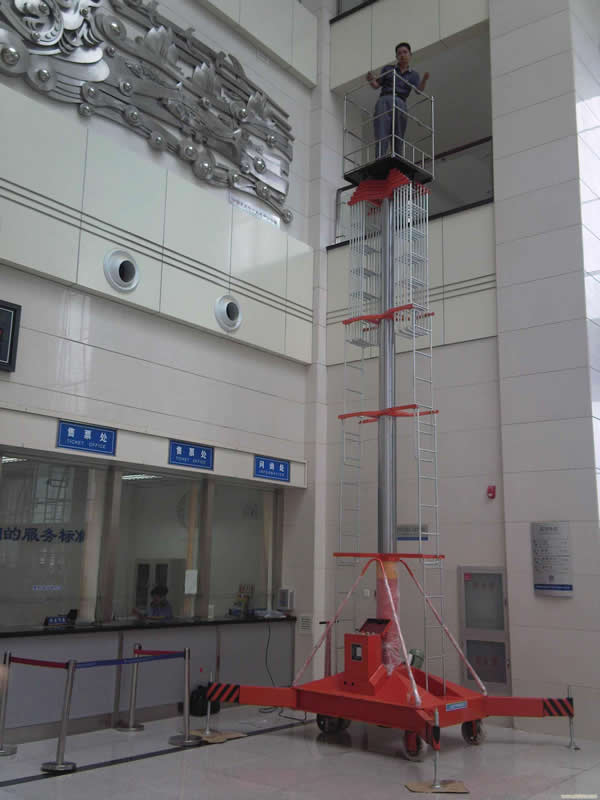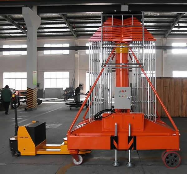 套缸式升降平臺具有設計新穎,體積小,外型美觀,操作維修方便,升降平穩等優點。整機由平臺、伸縮油缸、單梯式或雙梯式防轉機構、底盤油箱、支腿、行走輪等組成。平臺由伸縮油缸直接頂升,當啟動電機時,由電機帶動齒輪泵供油,油液經單向閥及電磁通道輸入油缸,伸縮油缸則逐節上升,當平臺升到最大高度時,系統壓力也就達到了額定工作壓力。